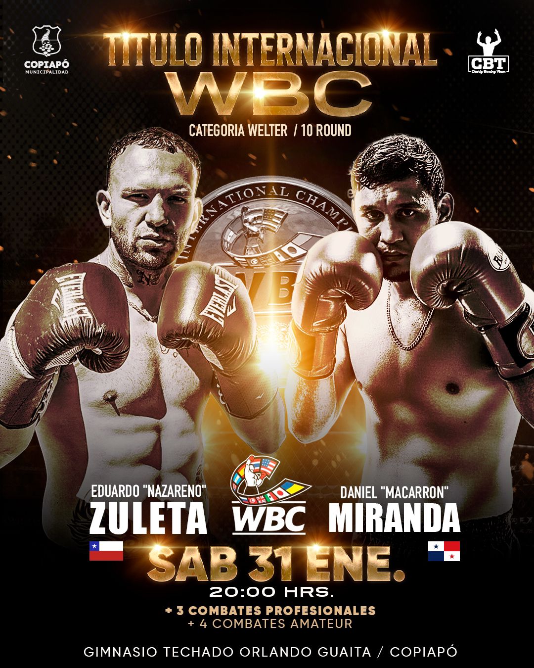 El próximo sábado 31 de enero, Copiapó será el epicentro del boxeo continental cuando el púgil local Eduardo “Nazareno” Zuleta, con un récord invicto de 17-0 se enfrentará al panameño Daniel “Macarrón” Miranda por el Título Internacional del Consejo Mundial de Boxeo (CMB) en la categoría welter (66,6 kg).
