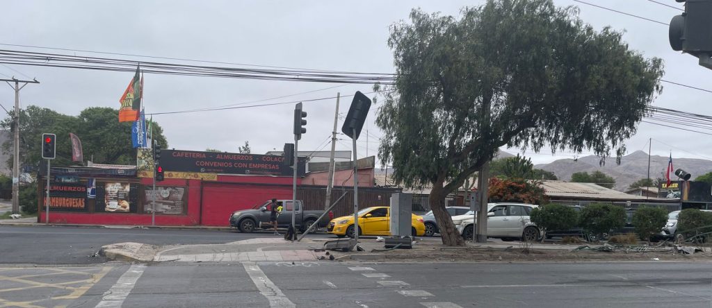El impacto también provocó daños en la infraestructura del sector, especialmente en el semáforo ubicado en la esquina.