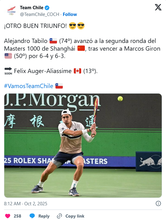 Alejandro Tabilo continúa avanzando en el Masters de Shanghái.
