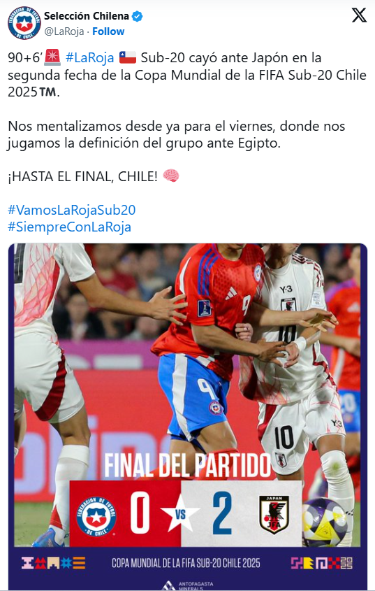 La Selección Chilena Sub 20 complicó sus aspiraciones mundialistas tras caer 0-2 ante Japón en su segundo partido del Grupo A.