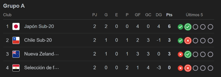 Japón lidera con 6 unidades y ya tiene asegurado su boleto a octavos. Más atrás aparecen Nueva Zelanda y Chile con 3 puntos; sin embargo, los neozelandeses presentan diferencia de gol neutra (0), mientras que el anfitrión queda con -1. Egipto, sin unidades, cierra la zona.