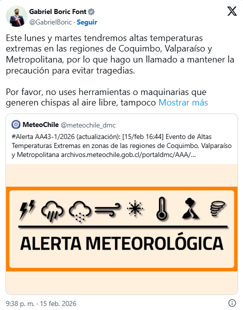 A través de su cuenta en X (ex Twitter), Boric pidió a la ciudadanía a actuar con responsabilidad para evitar tragedias que puedan surgir en medio de la ola de calor, la que ha proyectado máximas por sobre los 37°C.