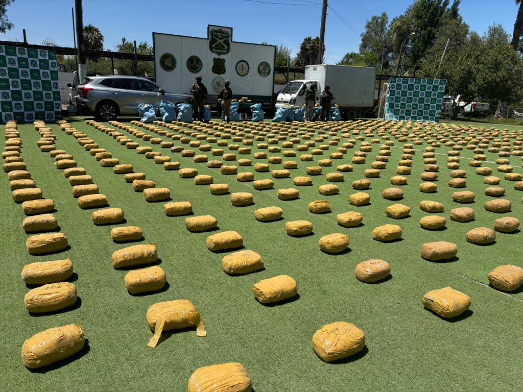La marihuana incautada estaba distribuida en mil paquetes envueltos en cinta adhesiva color café. Junto a la droga, se confiscaron dos vehículos menores, un camión y diversos elementos asociados al delito.
