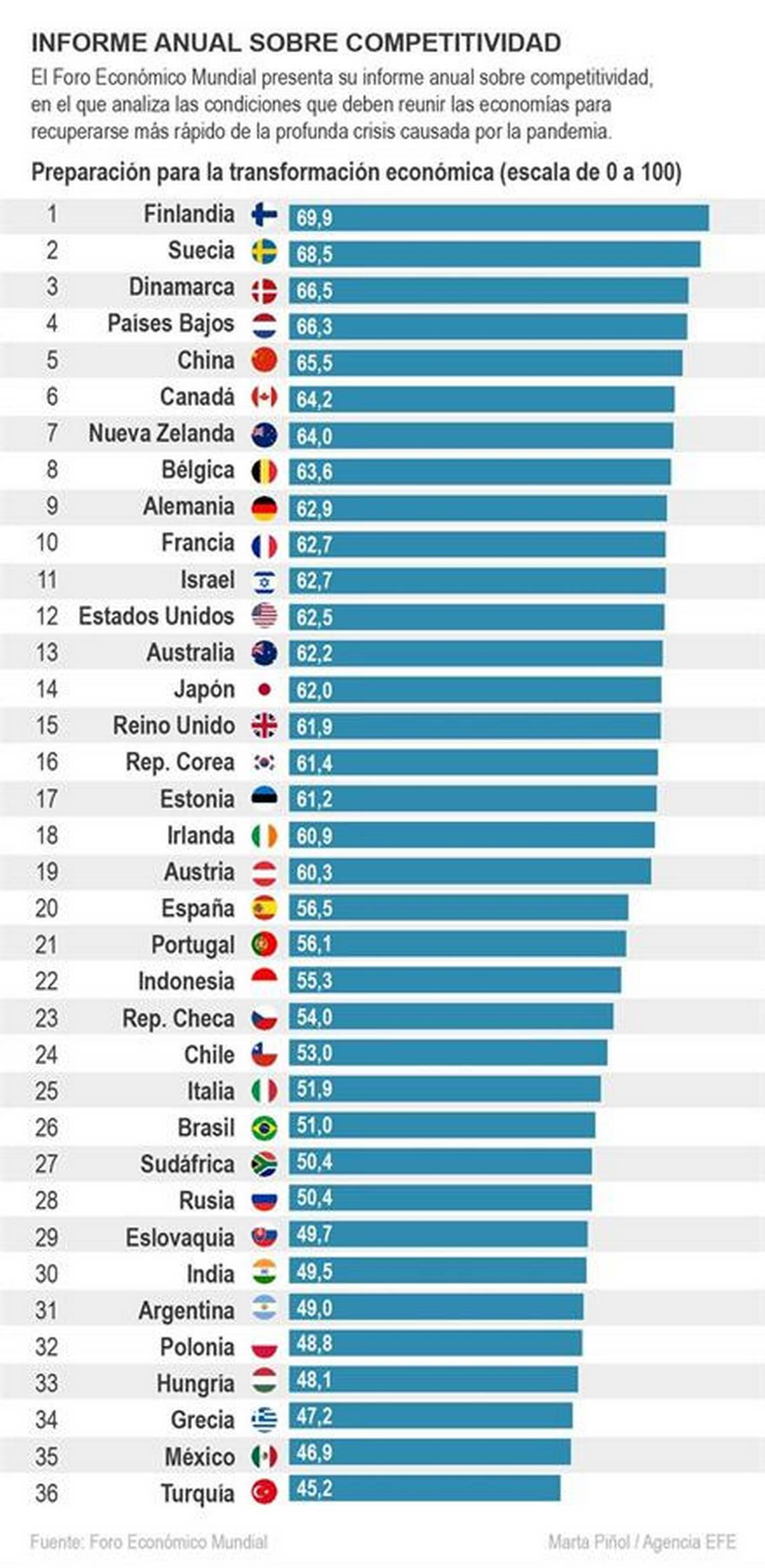 Finlandia, Suecia, Dinamarca, Países Bajos y China son, por este orden, los cinco países mejor posicionados para recuperarse, mientras que Alemania ocupa el noveno puesto, Francia el décimo, Estados Unidos el duodécimo, Japón el decimocuarto y España el vigésimo.