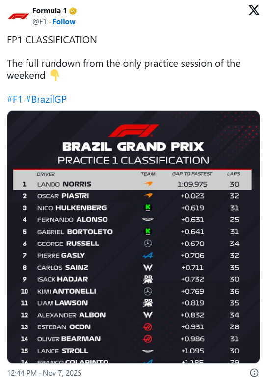 El inglés Lando Norris (McLaren), líder del Mundial de Fórmula 1, comandó este viernes, por delante de su compañero Oscar Piastri el único libre del Gran Premio de Sao Paulo (Brasil).