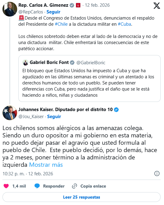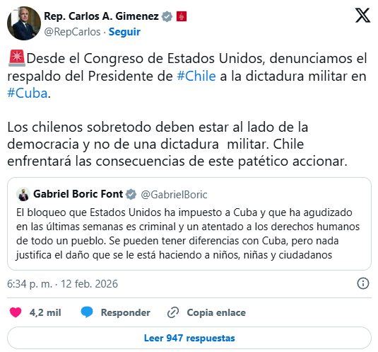 “Desde el Congreso de Estados Unidos, denunciamos el respaldo del Presidente de Chile a la dictadura militar en Cuba. Los chilenos, sobre todo, deben estar al lado de la democracia y no de una dictadura militar. Chile enfrentará las consecuencias de este patético accionar”, aseguró.