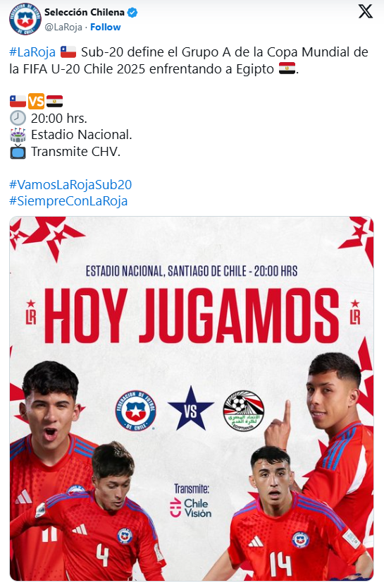 La Selección Chilena Sub 20 define este viernes su futuro en el Mundial Sub 20 cuando enfrente a Egipto en el Estadio Nacional, en el cierre del Grupo A. Tras la derrota 0-2 ante Japón, la Roja juvenil necesita al menos un empate para asegurar su clasificación a los octavos de final.