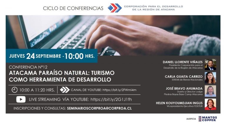 La Corporación para el Desarrollo de la Región de Atacama, CORPROA, a través de su presidente, Daniel Llorente Viñales, efectuó una invitación a un nuevo capítulo del “Ciclo de Conferencias CORPROA 2020”, esta vez a realizarse el día jueves 24 de septiembre a las 10:00 horas. Los exponentes en esta oportunidad serán la SEREMI de Bienes Nacionales, Carla Guaita Carrizo, junto a … Continúa leyendo CORPROA aborda el desafío del Turismo en Atacama, post pandemia.