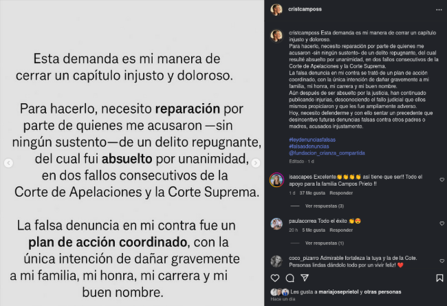 A través de su cuenta de Instagram, el artista escribió: “Esta demanda es mi manera de cerrar un capítulo injusto y doloroso. Para hacerlo, necesito reparación por parte de quienes me acusaron -sin ningún sustento- de un delito repugnante, del cual resulté absuelto, por unanimidad, en dos fallos consecutivos de la Corte de Apelaciones y la Corte Suprema”.