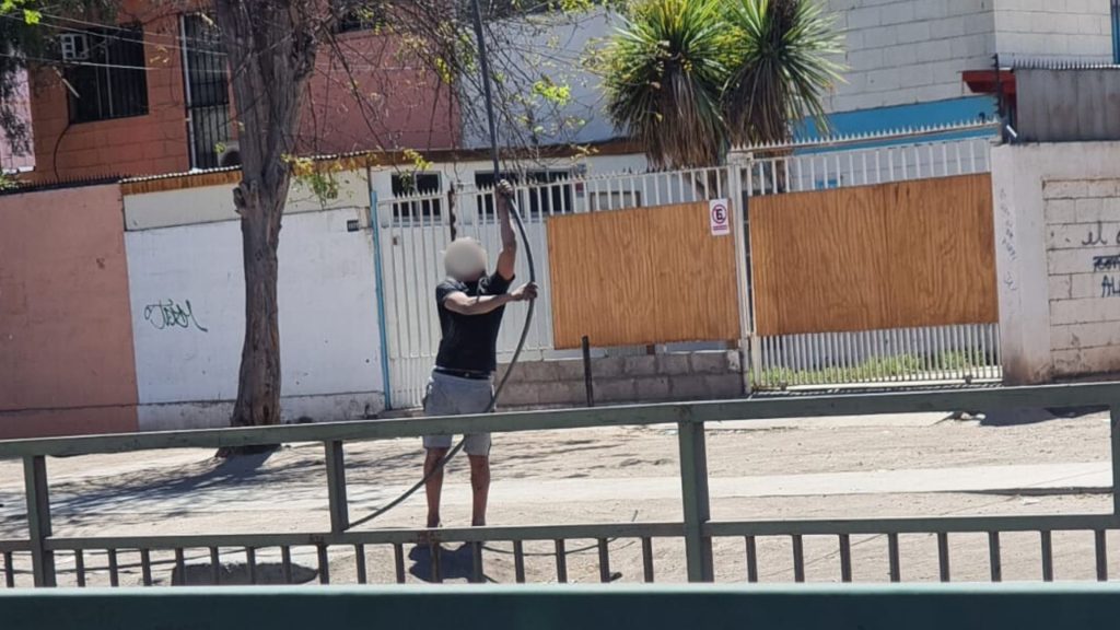 Según el testimonio entregado por el auditor, el individuo —un adulto— habría estado utilizando un cuchillo para cortar cables que, aparentemente, pertenecen a algún servicio básico. La imagen capturada muestra al sujeto en plena faena, en un sector donde el flujo vehicular y peatonal es constante.