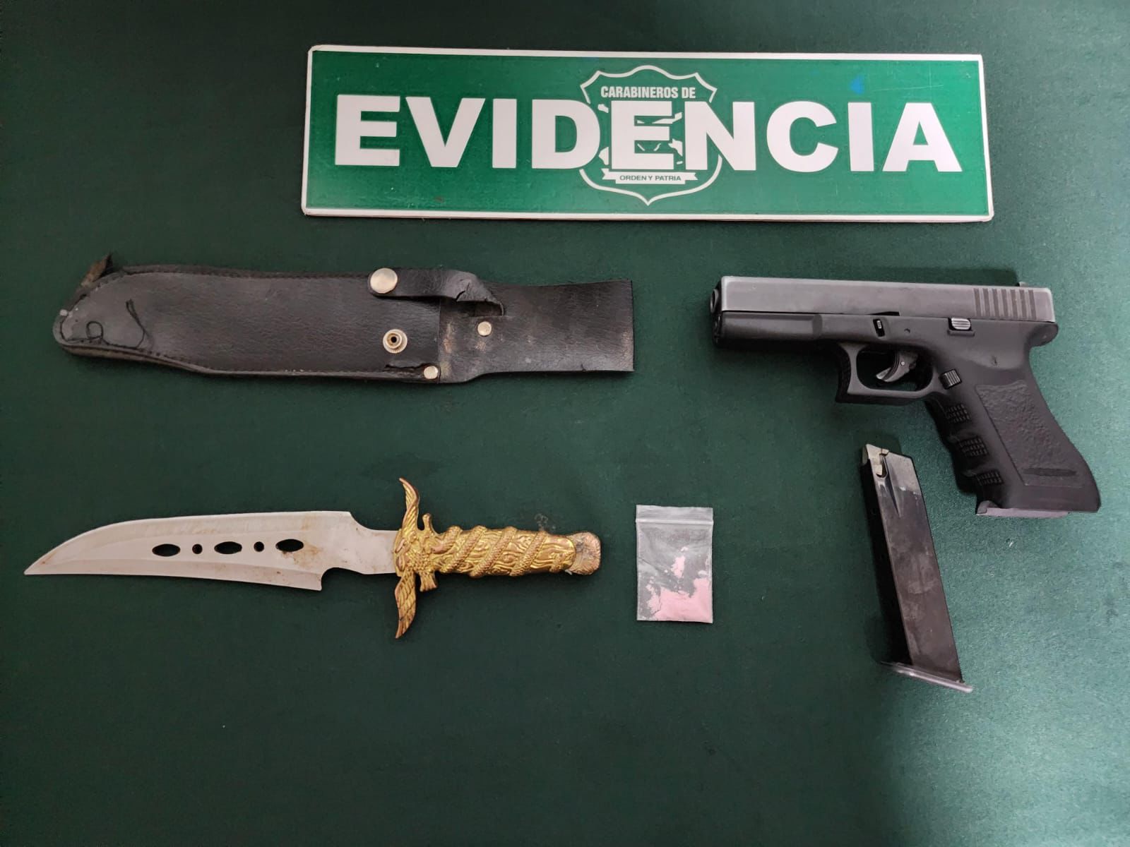 Tras una rápida y oportuna acción, Carabineros logró interceptar al individuo, quien portaba un arma a fogueo adaptada para efectuar disparos, además de un arma blanca tipo cuchillo y un envoltorio contenedor de ketamina.