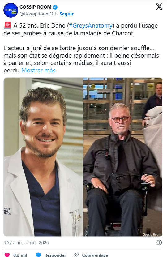 Fue en abril de este año cuando el actor Eric Dane, de 52 años, confirmó que fue diagnosticado con Esclerosis Lateral Amiotrófica (ELA). A casi seis meses, la estrella de ‘Grey’s Anatomy’ ya perdió la función del brazo derecho y su enfermedad avanza muy rápido.