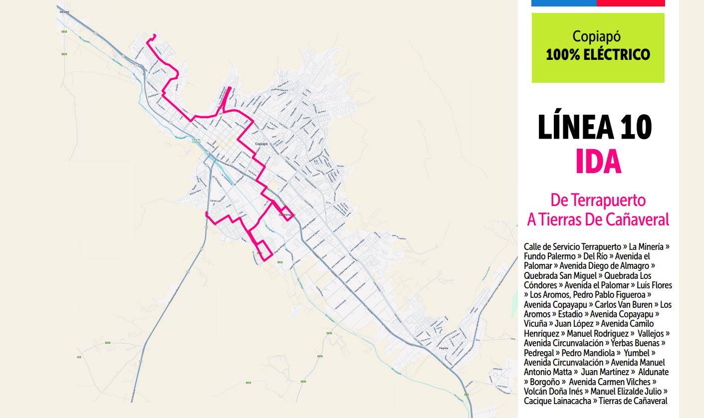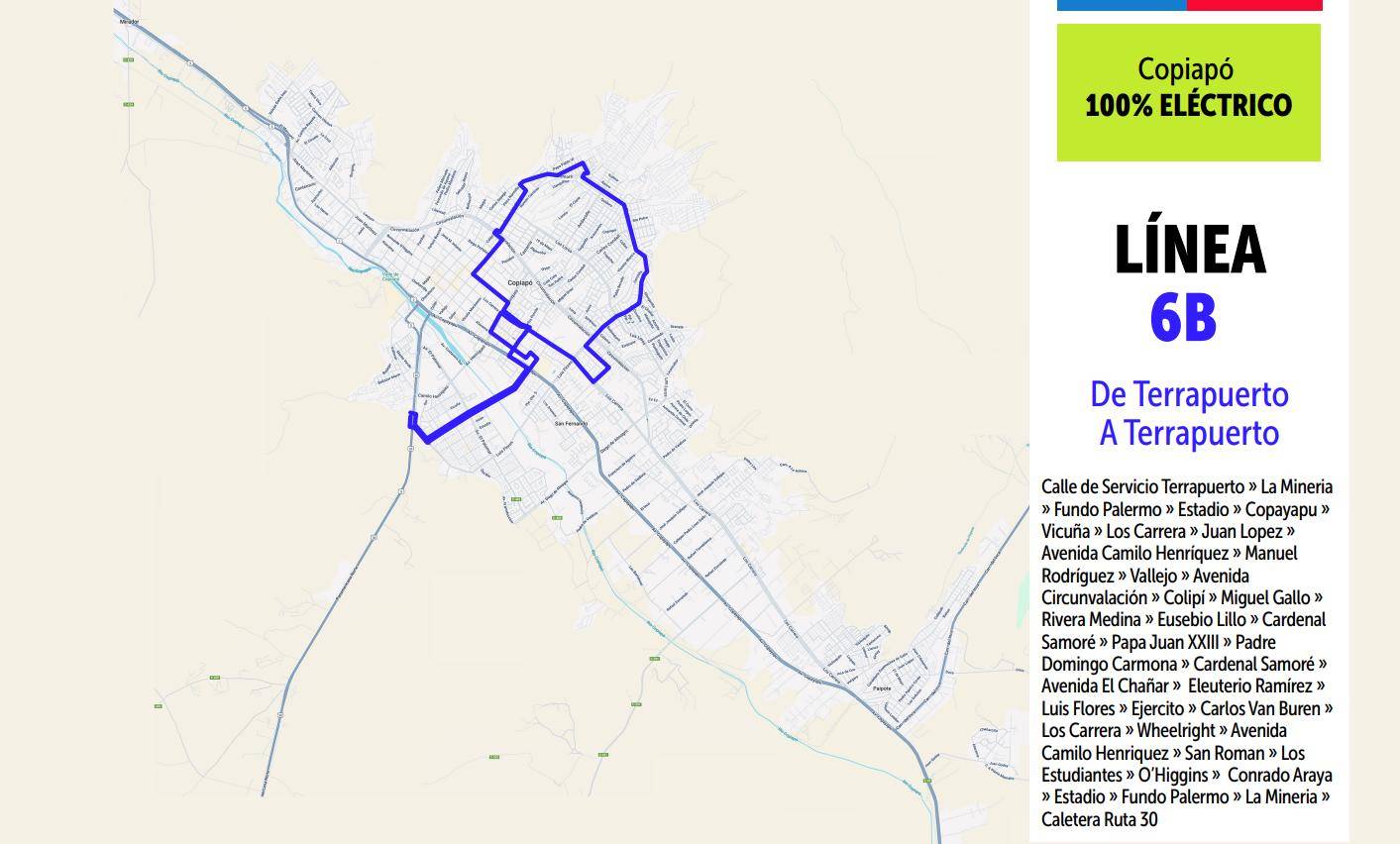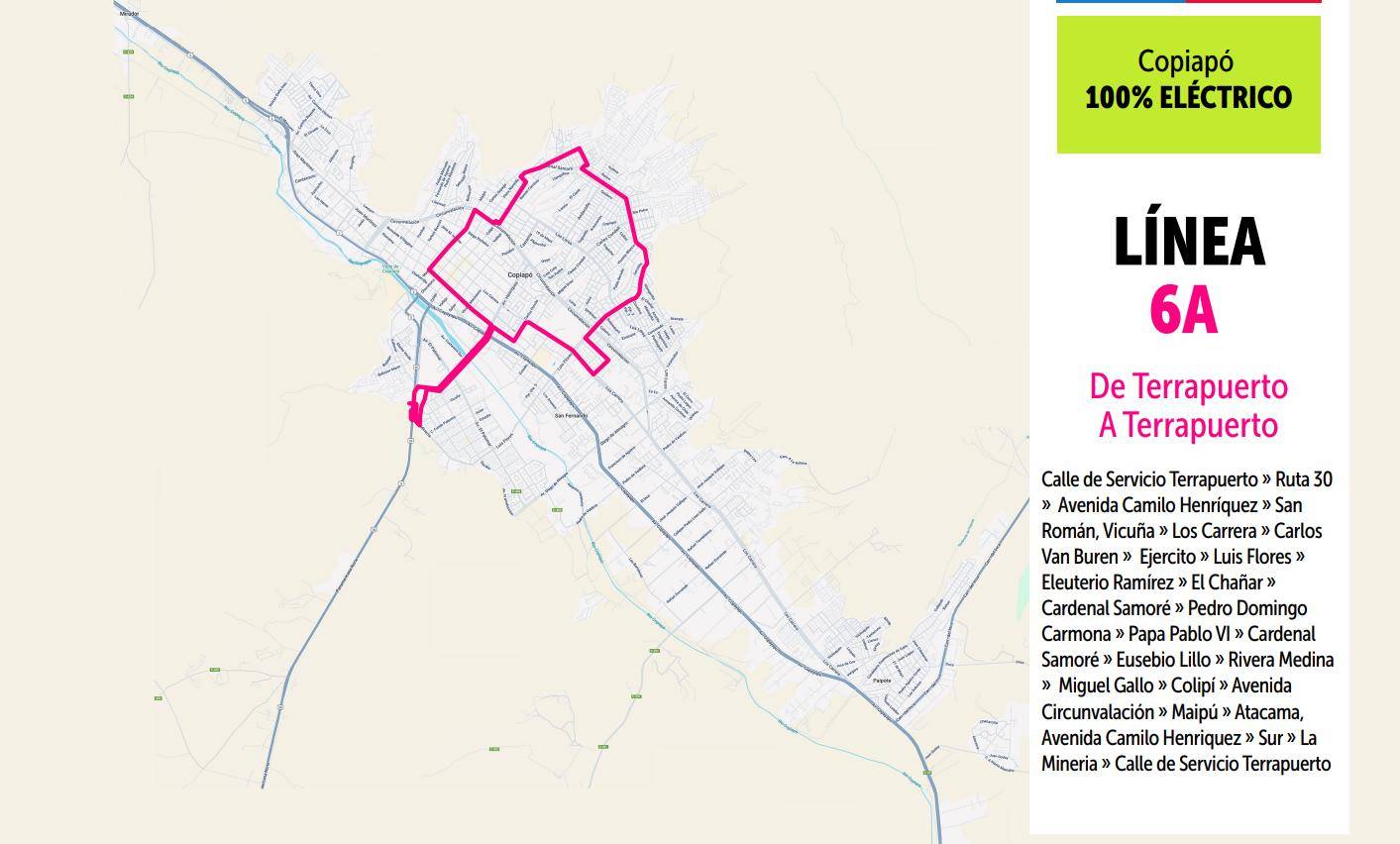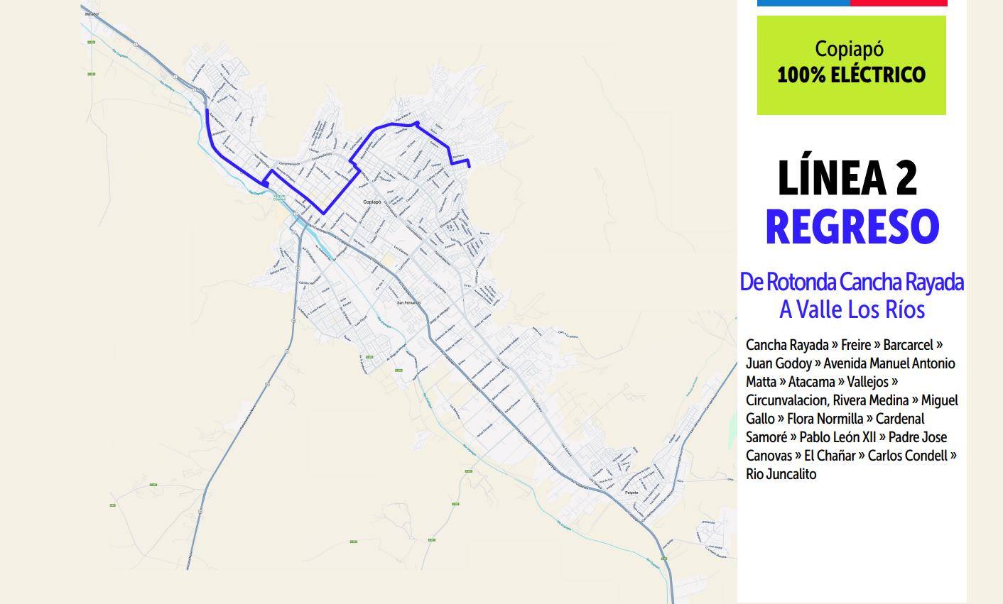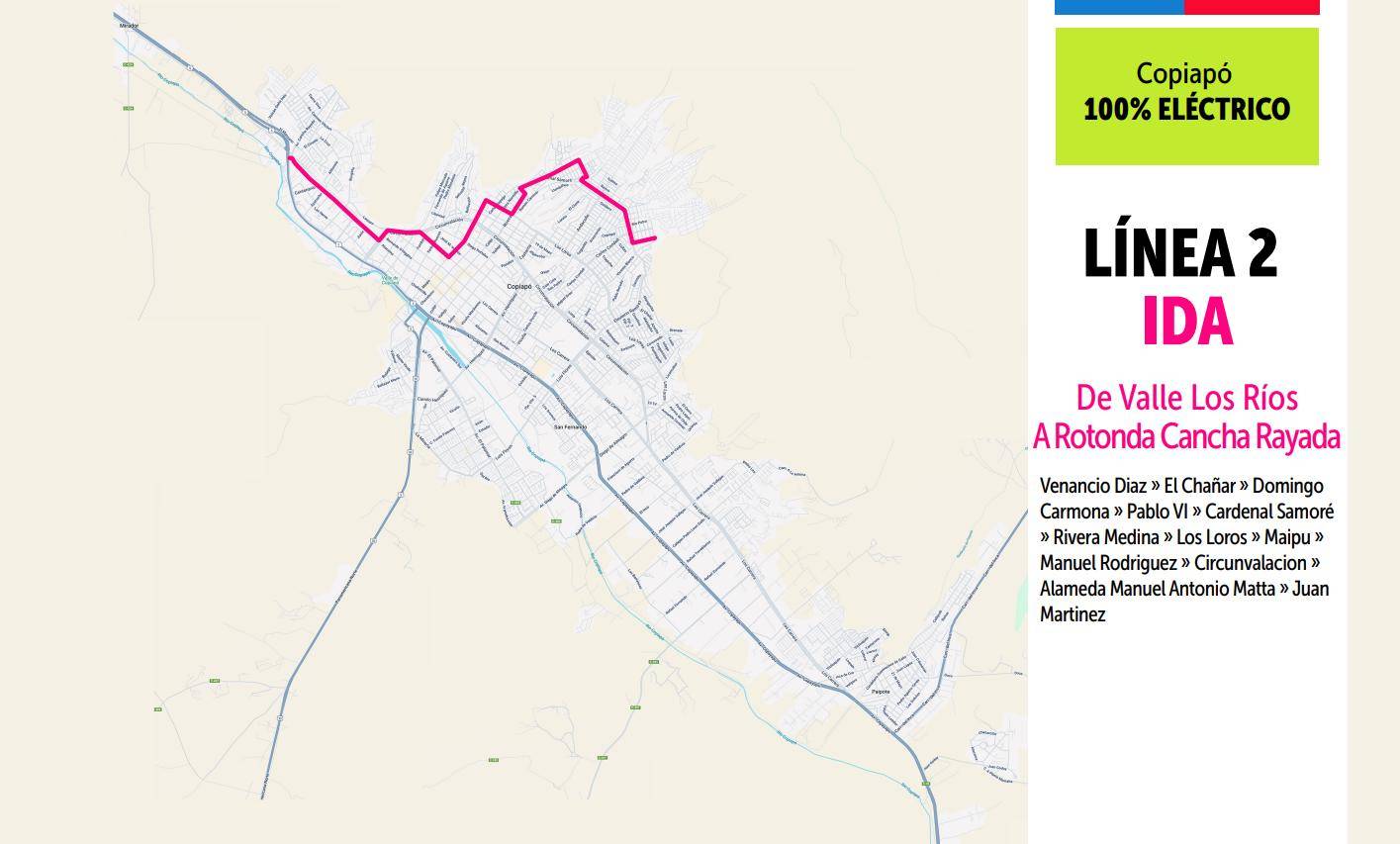 El nuevo sistema, denominado Red Copiapó, contempla una flota de 121 buses eléctricos de alto estándar, que realizan 12 recorridos dentro de la comuna, con operación diaria entre las 06:00 y 22:00 horas, y frecuencias reforzadas en horarios punta.