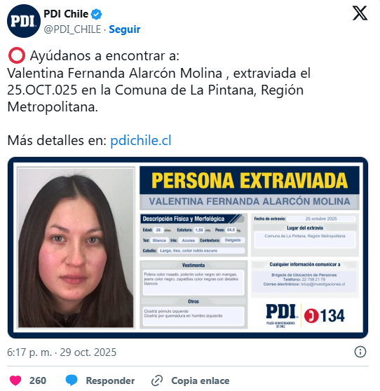 Se trata de Valentina Fernanda Alarcón Molina, quien el pasado sábado salió para ir, aparentemente, a un evento de barristas de la Universidad de Chile en la población Santo Tomás.