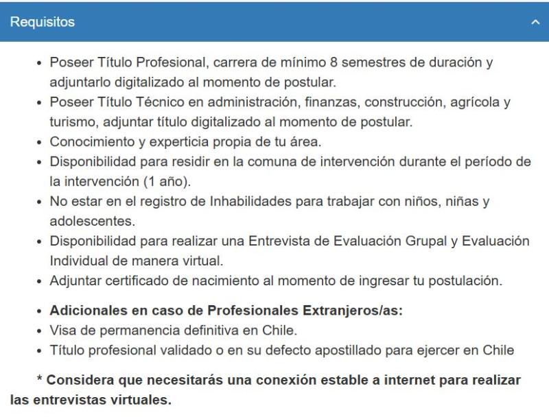 “Vamos a entregar un aporte a quienes queden seleccionados de $600.000 a $700.000 mensuales, dependiendo de la zona a la cual sean destinados. Además, un seguro de salud, pasajes de ida y vuelta, y más de 300 horas certificadas de capacitación en temas de políticas públicas, gobiernos locales y trabajo comunitario”, complementó la directora.
