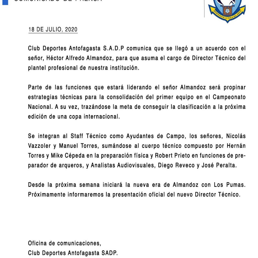 Y es así como hace días Almandoz había sido formalmente tentado por Deportes Antofagasta. Los buenos números en la dirección técnica del “León” lo convertían en foco de interés para los pumas.