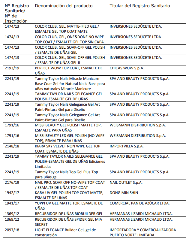 Desde el organismo detallaron que contienen el ingrediente Trimethylbenzoyl Diphenylphosphine Oxide, el cual está prohibido desde el 1 de septiembre de este año.