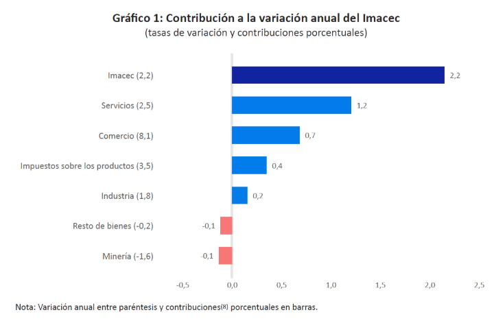 “El Imacec no minero presentó un crecimiento anual de 2,6%, mientras que en términos desestacionalizados aumentó 0,6% respecto del mes anterior y 3,0% en doce meses”, apuntó el ente emisor.