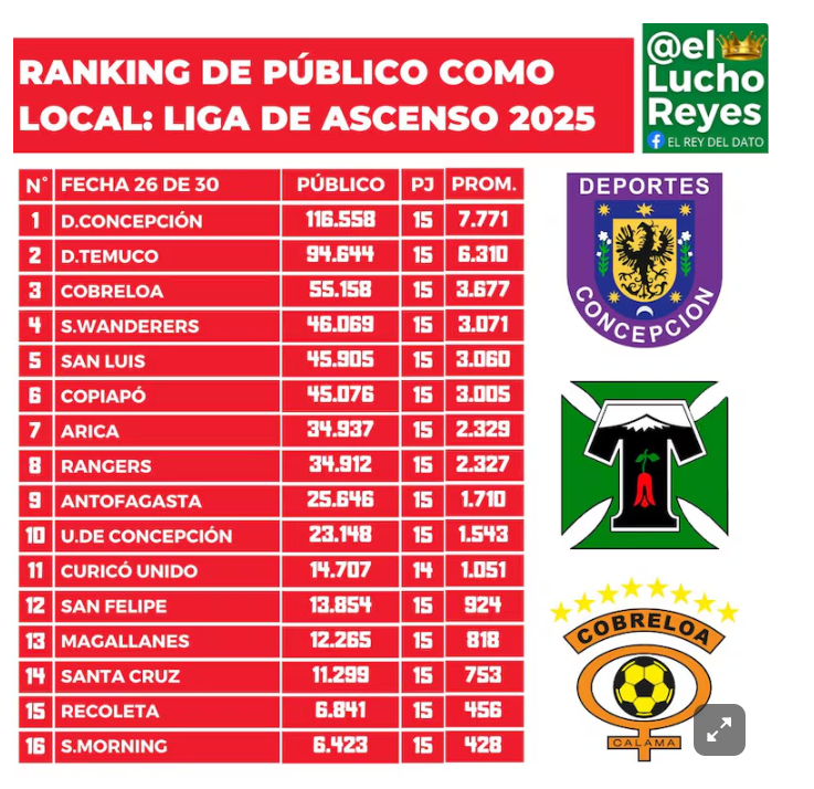 Deportes Concepción es el equipo que congrega más público en la Liga de Ascenso 2025. El elenco penquista llevó 116.558 personas a sus 15 partidos como local en el Ester Roa Rebolledo, con una media de 7.771 espectadores.