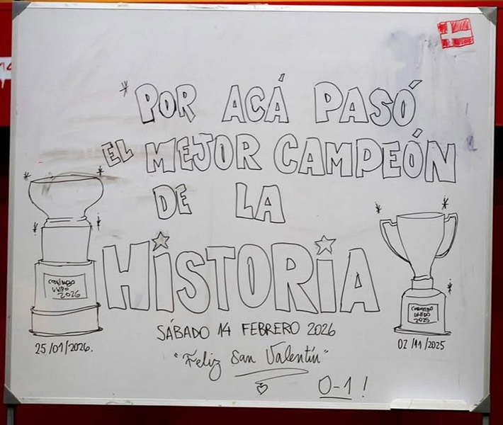 “Por acá pasó el mejor campeón de la historia. Feliz San Valentín“, rezaba el escrito dejado por Coquimbo en la pizarra del camarín. Además, escribieron la fecha del partido de este sábado y los dos títulos que ganó el cuadro “pirata” en los últimos meses.