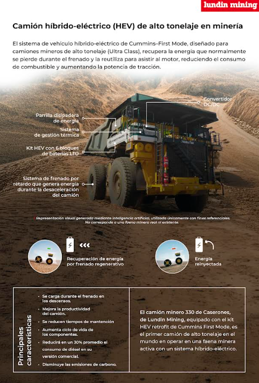 Lundin Mining anunció la puesta en marcha en su faena Caserones, ubicada a 4 mil metros de altura en la cordillera de la Región de Atacama, del primer camión minero híbrido-eléctrico (HEV) de gran tonelaje (Ultra Class) operando de forma comercial en minería a nivel mundial, un avance inédito para la industria que posiciona a Chile a la vanguardia de la innovación tecnológica aplicada a la electrificación del sector.