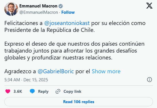 Felicitaciones a José Antonio Kast por su elección como presidente de la República de Chile”, escribió en español Macron en sus redes sociales.