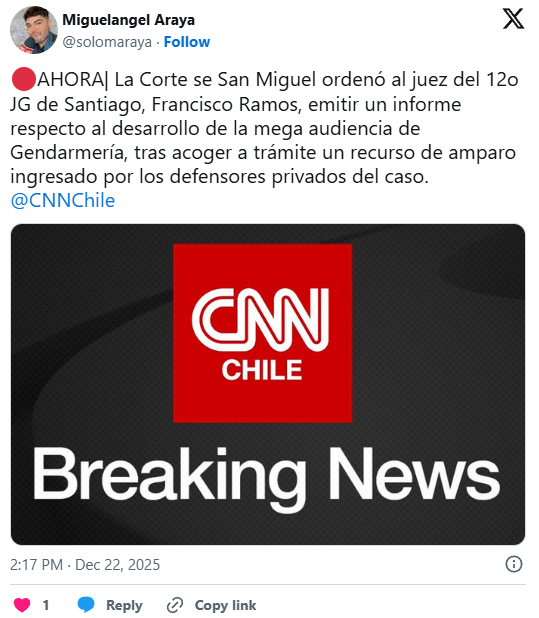 La Corte de San Miguel finalmente aceptó a trámite el recurso, ordenando al juez del 12° Juzgado de Garantía de Santiago, Francisco Ramos, emitir un informe respecto al desarrollo de la mega audiencia.