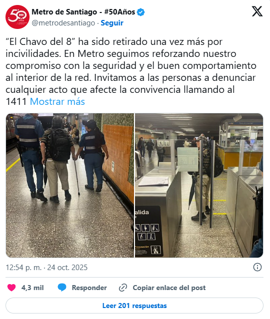 En una publicación en redes sociales, el tren subterráneo informó en sus redes sociales que este viernes “‘el Chavo del 8’ ha sido retirado una vez más por incivilidades. En Metro seguimos reforzando nuestro compromiso con la seguridad y el buen comportamiento al interior de la red”.