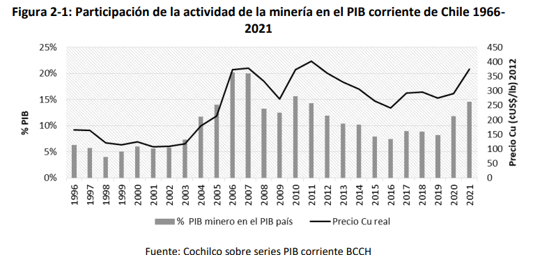El reporte señala que en términos directos la minería ha ponderado, en promedio, un 10% del PIB en el periodo 1996-2021. Con periodos como 2006 y 2007 donde superó el 20% y, como 1998, donde su aporte fue inferior al 5%.