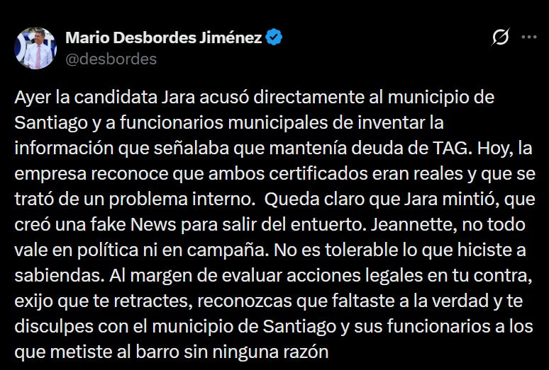 “La información que circula sobre tus deudas de tag no proviene de funcionarios municipales ni ha salido de ninguna base de datos o fuente municipal. En otras circunstancias, quizás nos querellaríamos por semejante falsedad. No te voy a dar en el gusto en plena campaña. Después del 14 conversamos“, comenzó expresando en su cuenta de X.