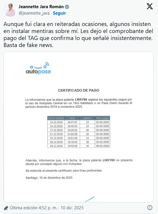 Por su parte, Jara acusó que la noticia era falsa y luego compartió un certificado de pago, en el que se observa que los pagos de la infracción por uso de Autopista Central sin un tag habilitado o Pase Diario fueron realizados al poco tiempo después.