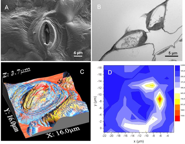 Estomas de las hojas de lechuga Romana. (A) Imagen de la topografía de un estoma obtenida con un microscopio electrónico de barrido. (B) Sección trasversal de un estoma, observada mediante microscopía electrónica de transmisión. (C) Imagen de microscopía de fuerza atómica (AFM) de un estoma, que muestra una composición química heterogénea, con un diagrama de color que destaca zonas hidrofílicas (azuladas) e hidrófobas. (D) Distribución de los carotenoides en zonas cercanas a un estoma, observadas con microscopía confocal-Raman.