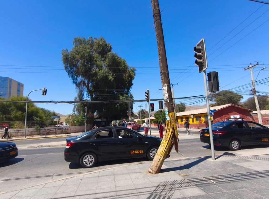 Preocupación entre peatones y automovilistas ha generado el estado en que se encuentra un poste ubicado en la intersección de calle Vicuña con avenida Los Carrera, en Copiapó, luego de un accidente de tránsito ocurrido durante la madrugada del sábado 13 de diciembre.