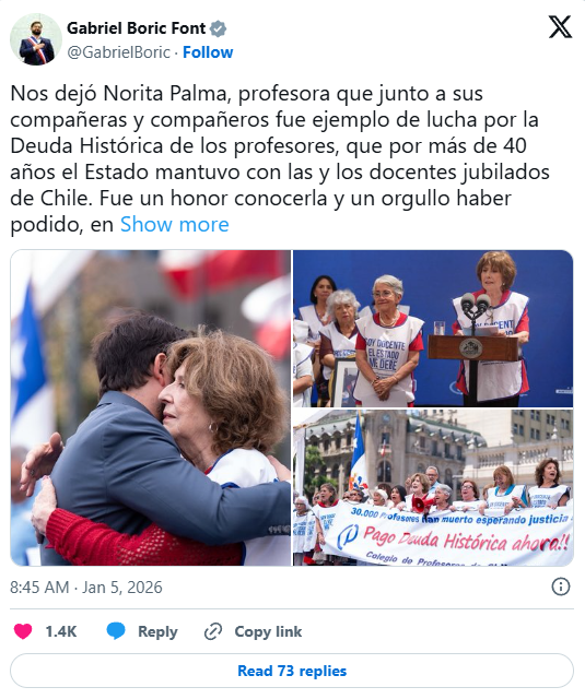 En sus redes sociales, el mandatario señaló: “Nos dejó Norita Palma, profesora que junto a sus compañeras y compañeros fue ejemplo de lucha por la Deuda Histórica de los profesores, que por más de 40 años el Estado mantuvo con las y los docentes jubilados”.