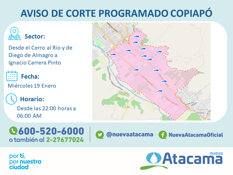 Ante dudas o consultas, pueden contactarse al 600 520 6000 o revisar el perímetro afectado en la página de la empresa en www.NuevaAtacama.cl.