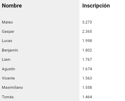 Por otra parte, en el caso de los niños el nombre favorito para recién nacidos fue Mateo, que registró 3.274 inscripciones. Gaspar quedó en segundo lugar con 2.365 y luego Santiago con 2.021. Completan el top ten Lucas, Benjamín, Liam, Agustín, Vicente, Maximiliano y Tomás.