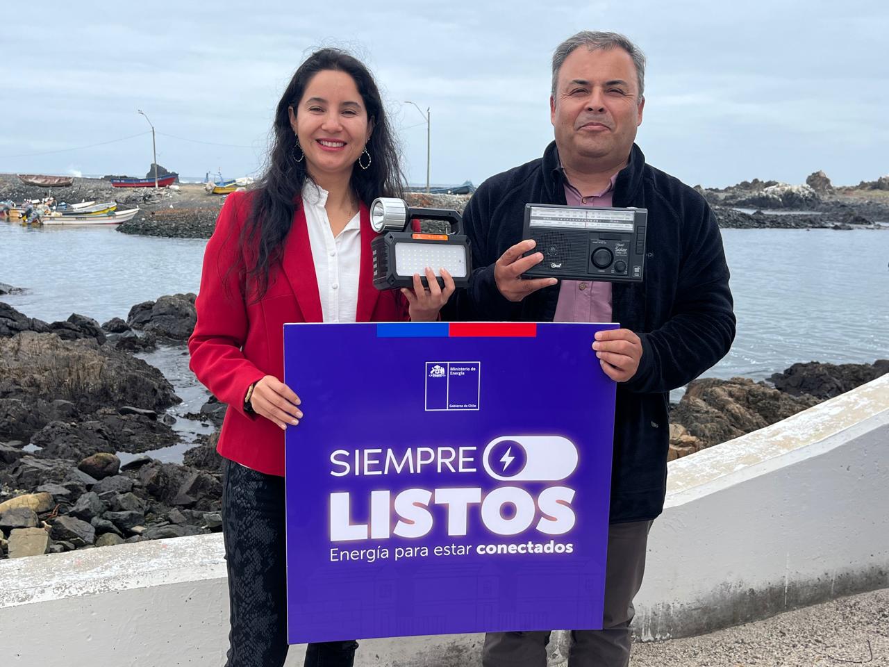 En Carrizal Bajo, la secretaria regional del ramo, Yenny Valenzuela y el alcalde Genaro Briceño, entregaron kits de resiliencia energética, los que incluyen un banco de energía con linternas y ampolletas, y una radio solar.