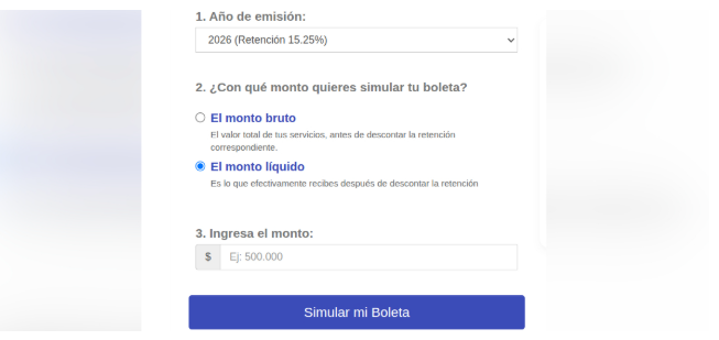 El SII puso a disposición el siguiente simulador para calcular los valores de la boleta de honorarios, considerando la retención de 15,25 % vigente desde el 1 de enero de 2026.