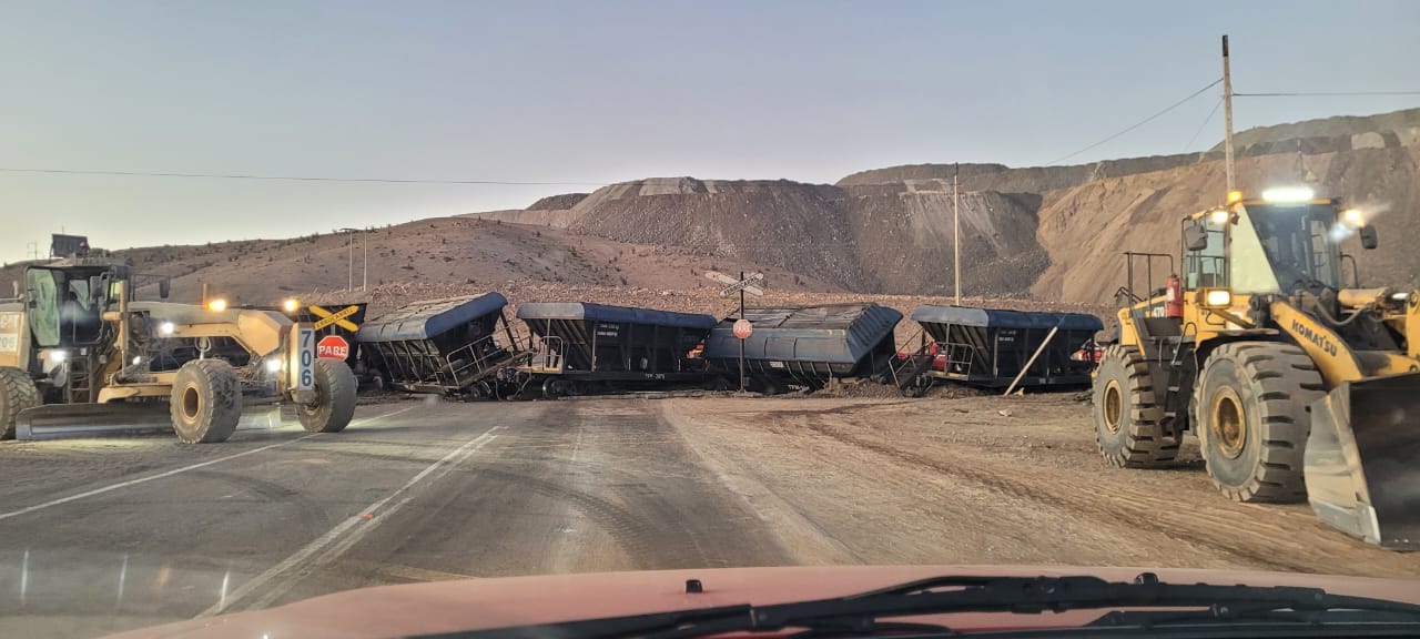 El hecho ocurrió durante la madrugada de este jueves, cuando la maquina se encontraba iniciando su recorrido desde la Mina Los Colorados, por causas que se desconocen, algunos carros salieron de la vía, derramando el preconcentrado de hierro que transportaba.