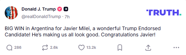 “Felicitaciones al presidente Javier Milei por su aplastante victoria en Argentina. ¡Está haciendo un trabajo excelente! El pueblo argentino justificó nuestra confianza en él”, publicó Trump en la red Truth Social, mientras se encuentra de viaje rumbo a Japón.